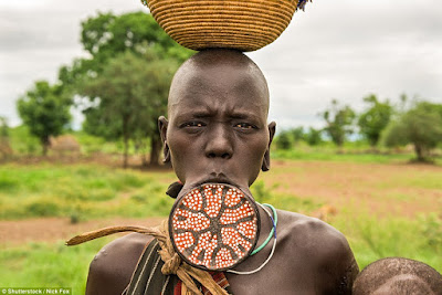 Wanita dari suku kaum Afrika Mursi di Omo Valley Ethiopia, dengan bibirnya ditebuk kemudian dimasukkan cakera atau plat.