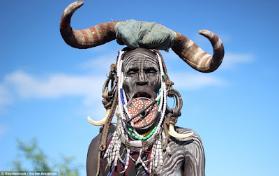Seorang lagi wanita dari kaum Mursi memakai plat bibir dan satu set tanduk lembu di atas kepalanya. Semakin banyak perhiasan danaksesori digunakannya, lebih tinggi kedudukannya dalam masyarakat merek