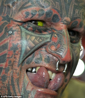 Sementara itu, Victor Peralta (gambar kanan) dari Argentina, mempunyai 90 peratus daripada tubuhnya dipenuhi dengan tatu. Lidahnya juga diubah suai untuk kelihatan bercabang.
